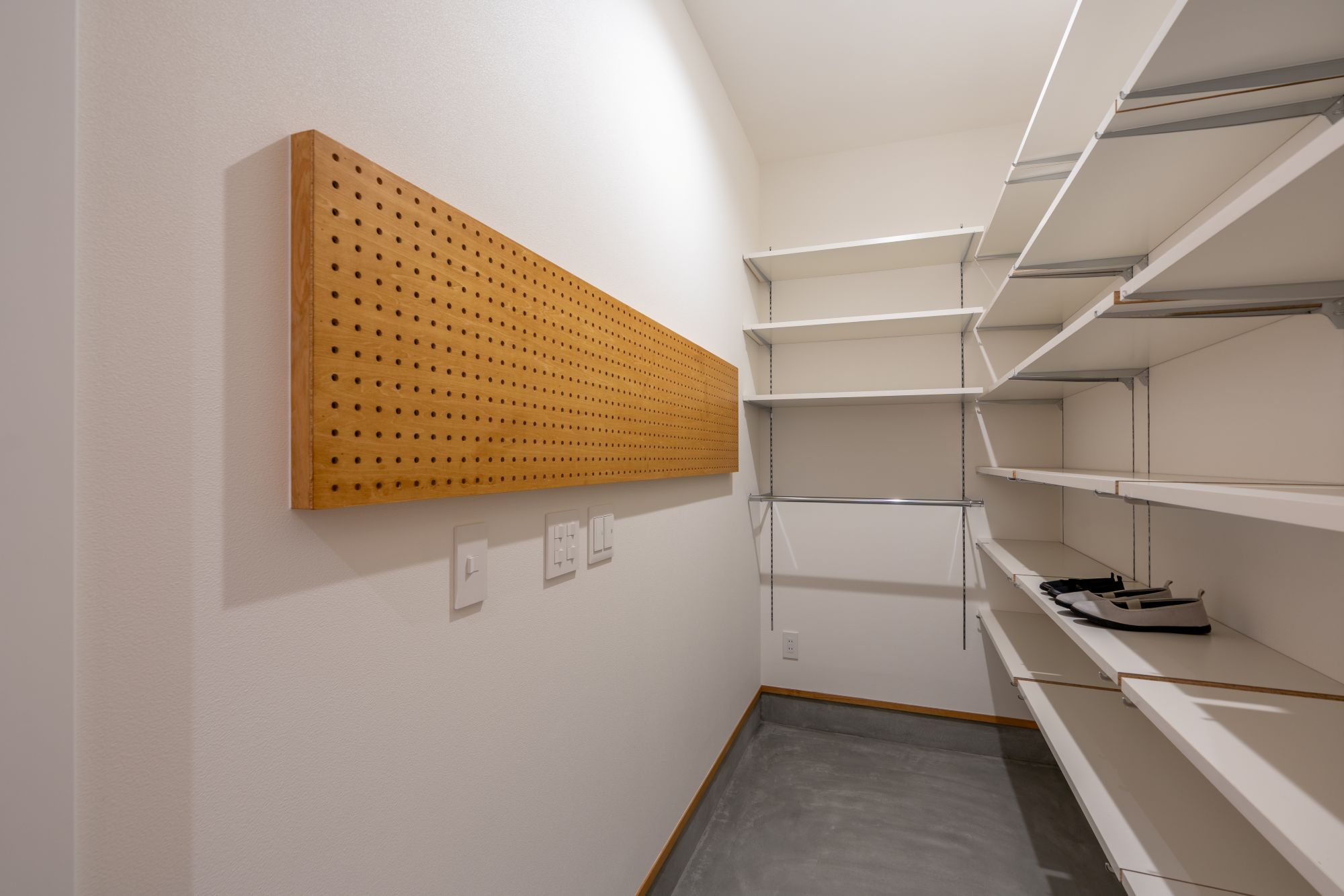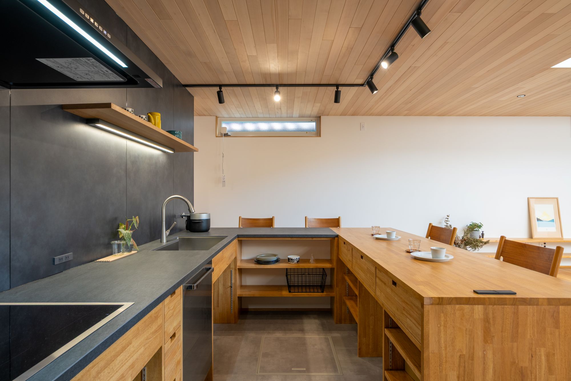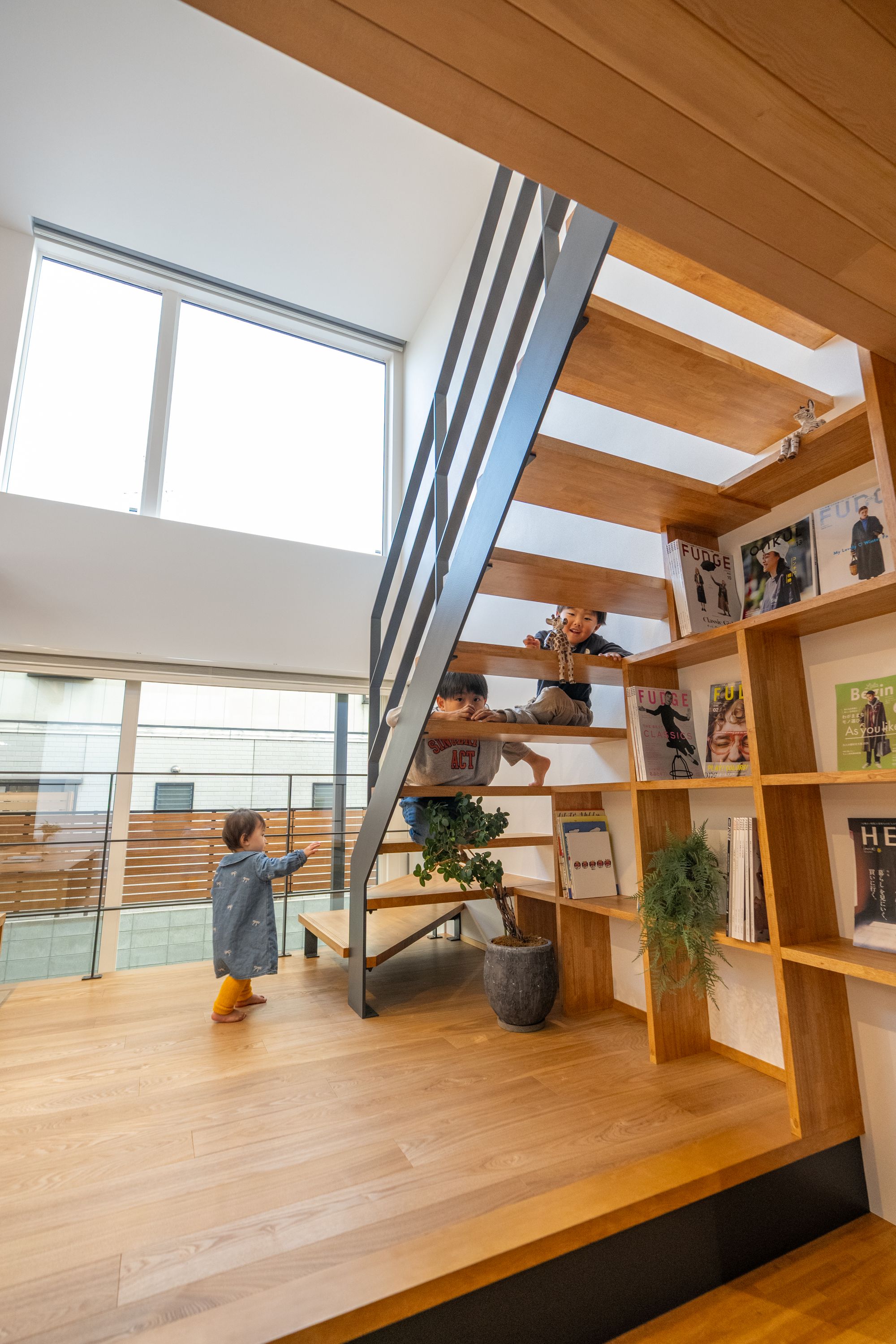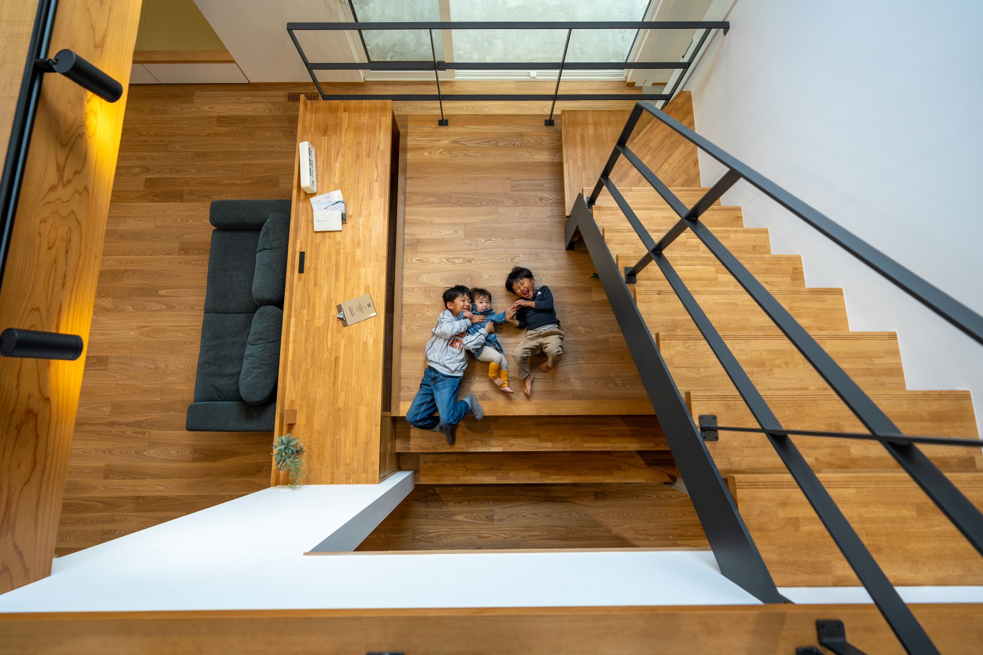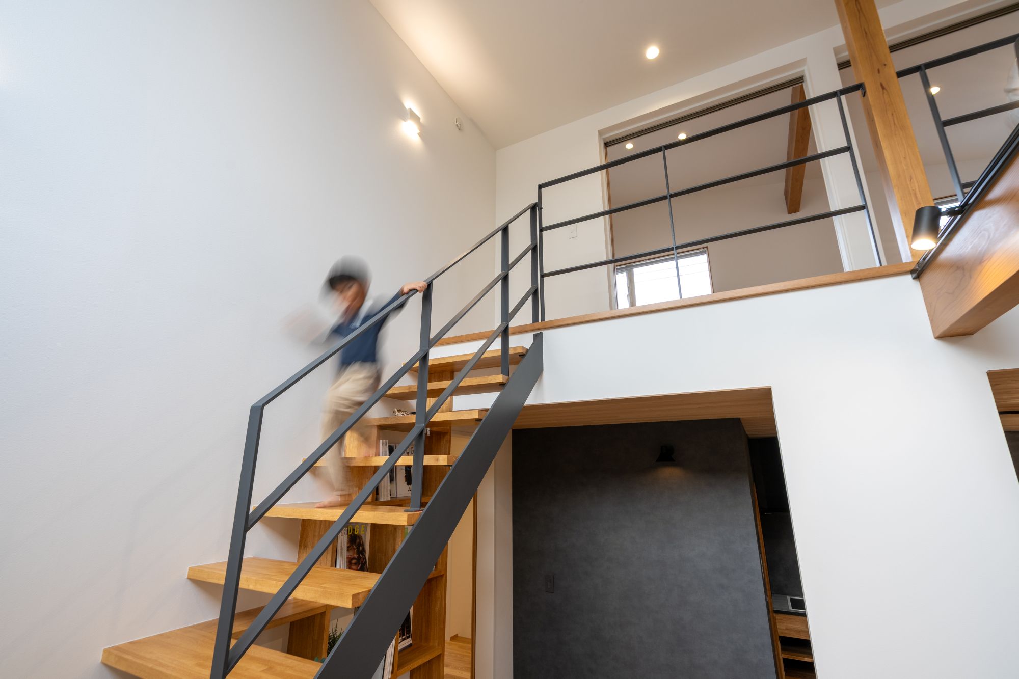 吹き抜けを中心とした構成により、上下階のつながりを確保し、どこにいても家族の気配を感じられる住まいとしました。